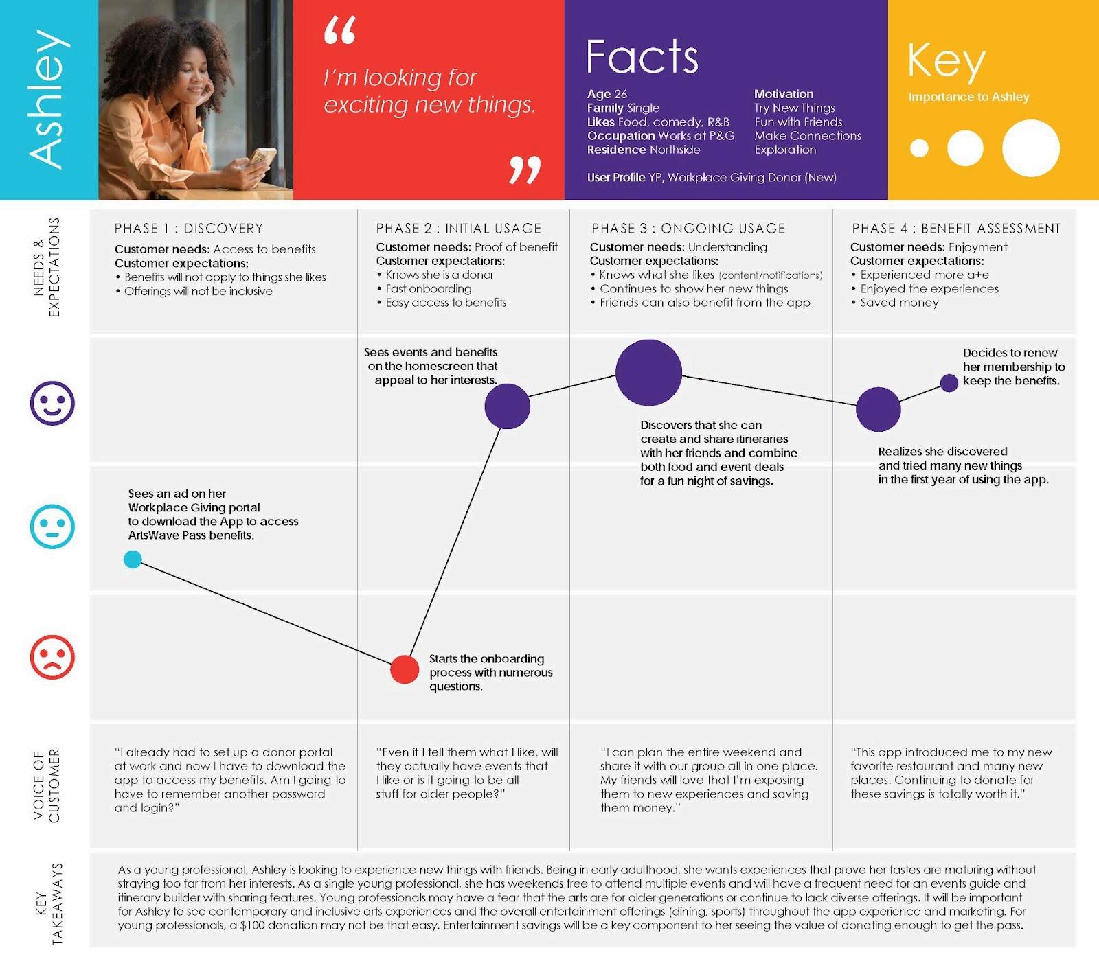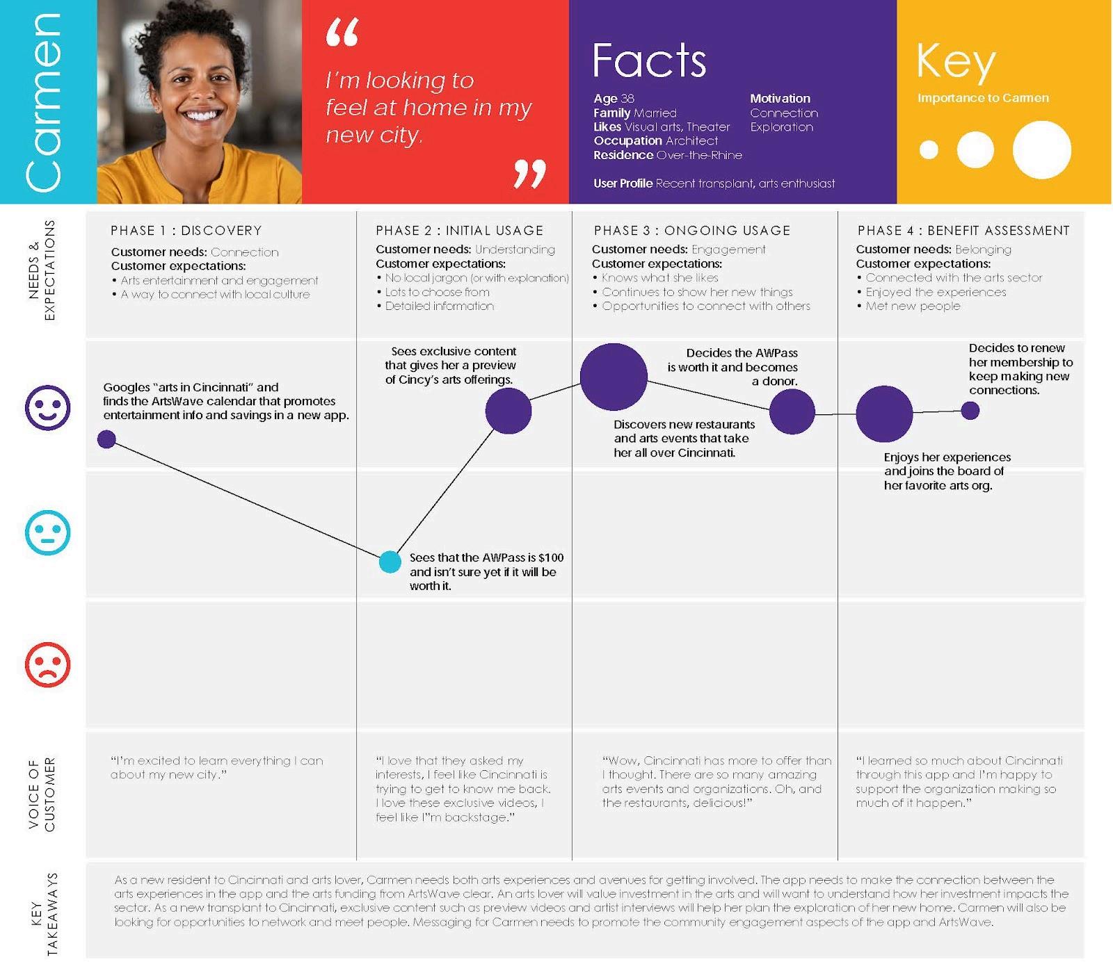 To ensure the ArtsWave App meets the needs of its diverse users, we developed personas representing different audience segments. These include existing ArtsWave donors, Cincinnati residents seeking arts and entertainment experiences, and newcomers or visitors looking to explore the city’s vibrant cultural scene. Understanding these unique user journeys helped shape the app’s design and features. Explore some of our persona journey maps below to see how the app enhances arts engagement for different users.